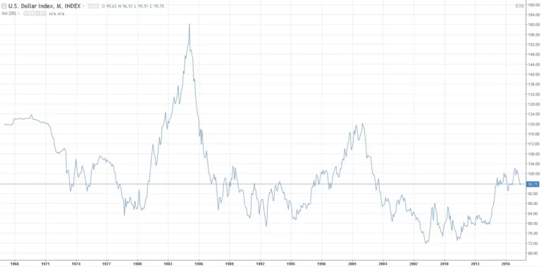 Индекс доллара стал очень полезным критерием для доллара после того, как Бреттон-Вудская система фиксированных валютных курсов начала рушиться, и президент Никсон в августе 1971 года в одностороннем порядке прекратил конвертировать доллар США в золото.
