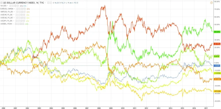 Индекс доллара измеряет стоимость доллара США по отношению к корзине иностранных валют. Это торговые партнеры США, а именно: евро, японская иена, британский фунт, канадский доллар, шведская крона и швейцарский франк.