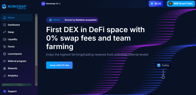 Децентрализованная биржа Nomiswap от Nominex была создана на базе Binance Smart Chain для обмена различными токенами формата BEP-20. По мере развития площадки планируется добавить поддержку других блокчейнов. Лучше всего использовать CEX и DEX в паре – пользователи обеих платформ получают дополнительные бонусы. Есть возможность получать кэшбэк, участвуя в фарминге ликвидности, благодаря чему повышается уровень аккаунта от Start до MAX, где комиссии возвращаются полностью. Для дополнительного заработка можно участвовать в лаунчпулах и стейкинге NMX.