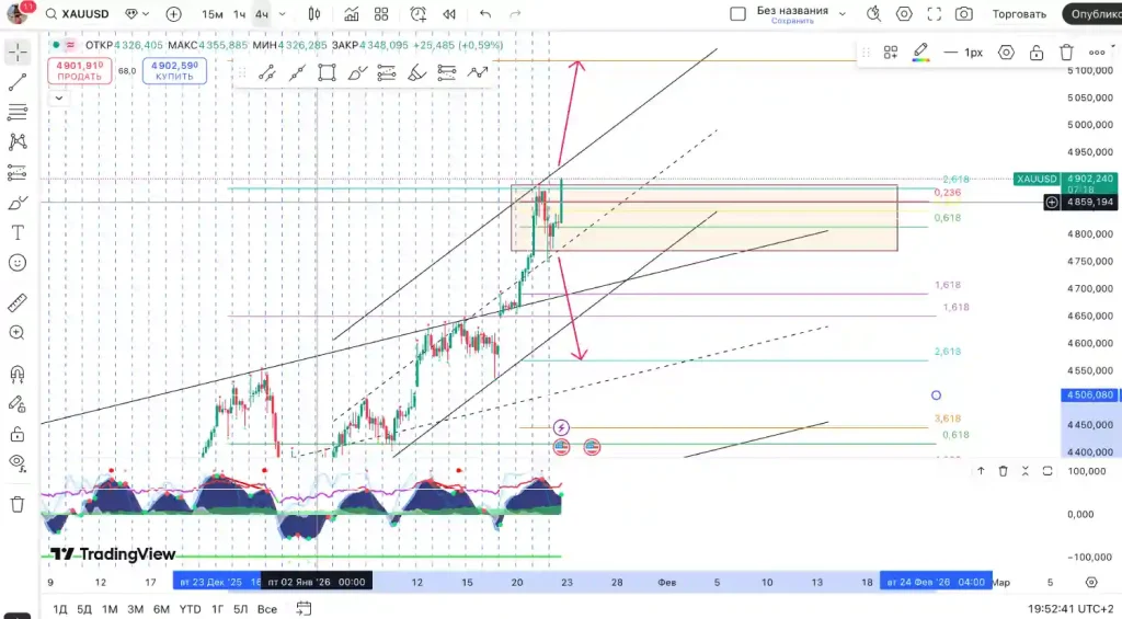 Завершение коррекции может означать, что текущая цена будет колебаться около уровня ~4760–4800 USD за унцию в течение дня.